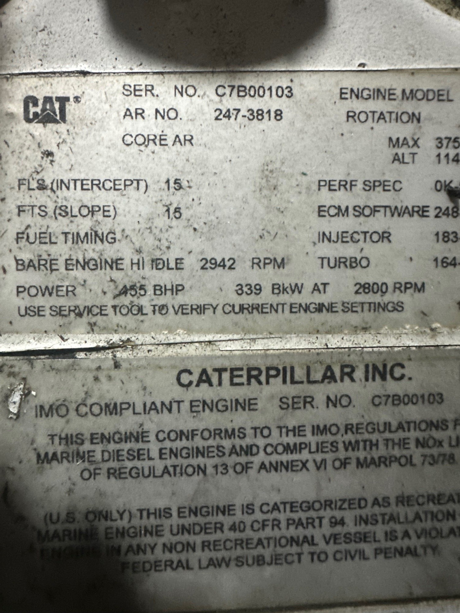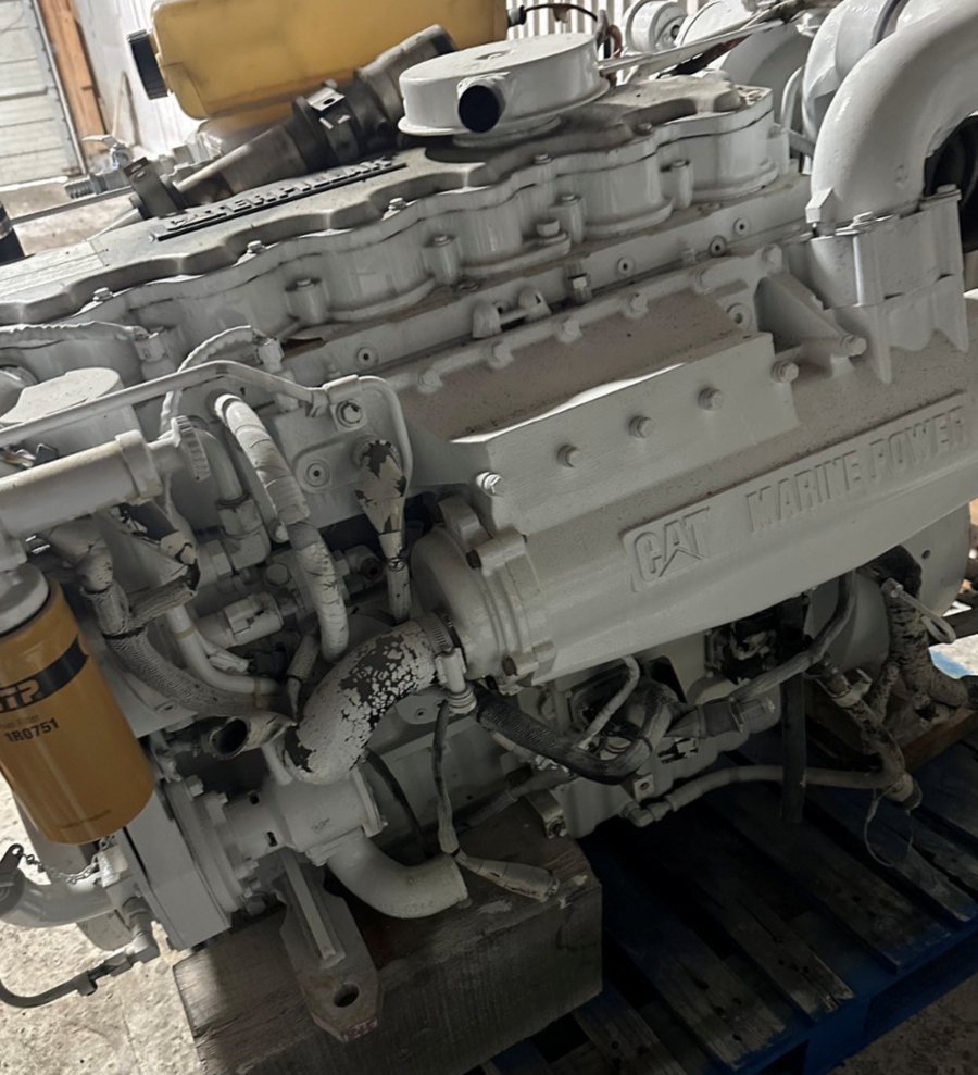 We have one zero-hour rebuilt Caterpillar C7 marine propulsion engine available and rated at 455hp at 2800rpm. Heat-exchanger cooled. Pleasure craft rated.